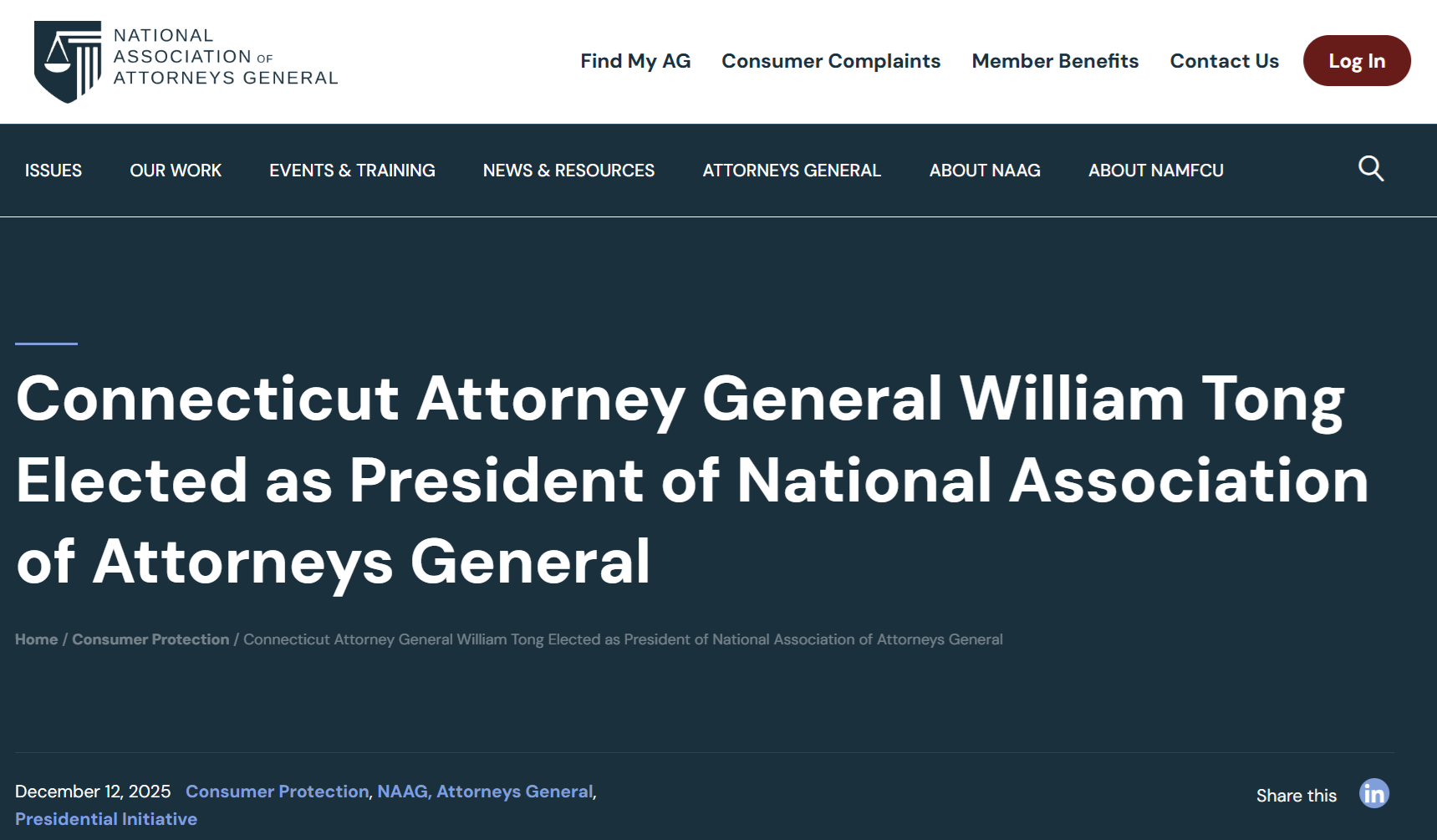 【LAPost|华盛顿/洛杉矶综合报道|2025年12月12日】– 全美州检察长协会(National Association of Attorneys General,简称 NAAG)于12月12日宣布,在12月8日至10日举行的年度“首都论坛”(Capital Forum)期间,康涅狄格州总检察长 William Tong(汤伟麟)当选为协会新一任主席。汤伟麟将接替2025年度主席、新罕布什尔州总检察长 John Formella,出任 NAAG 主席职务。